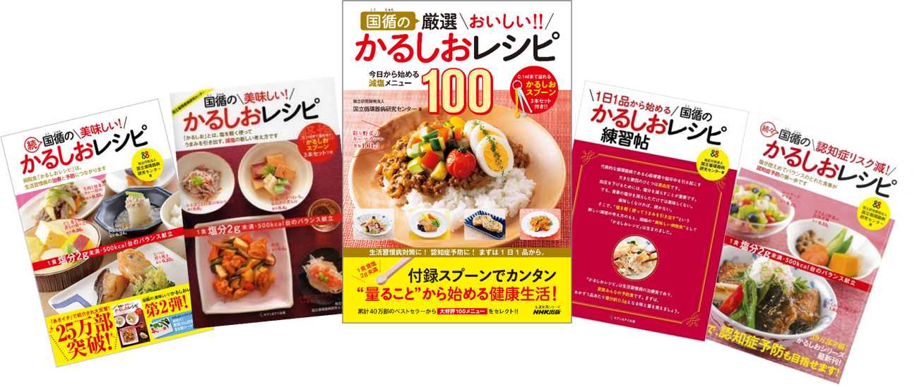 「あの食事を家庭でも食べたい」という退院された患者さんから、予防のためにも食塩を控えた食生活に関心があるといった方まで、おいしい減塩食をより多くの方に日常的に食べていただけるように、当センターでの減塩食のノウハウを紹介した、レシピ本『国循の美味しい!かるしおレシピ』(セブン&アイ出版)も発売しました。これまでに、著作・監修も含め6種類のかるしおレシピ本を発刊し、約40万部のベストセラーとなりました。2021年6月1日には、過去のかるしおレシピ本シリーズの書籍から厳選し『国循の厳選 おいしい!! かるしおレシピ今日から始める減塩メニュー』(NHK出版)を発刊いたしました