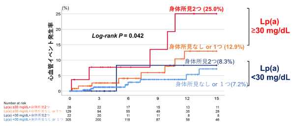 - 角膜輪およびアキレス腱肥厚がともに存在し、かつLp(a)が30 mg/dL以上である患者は、将来の心血管イベントのリスクが最も高かった。