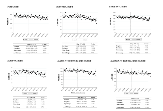 (A)総入院数, (B) 20-49歳の若年入院患者数, (C) 喫煙入院患者数, (D) HTP普及率の高い東京11.8%での入院患者数 (E) HTP普及率の高い10都道府県11.6%での入院患者数 (F) HTP普及率の低い地域6.6%での入院患者数