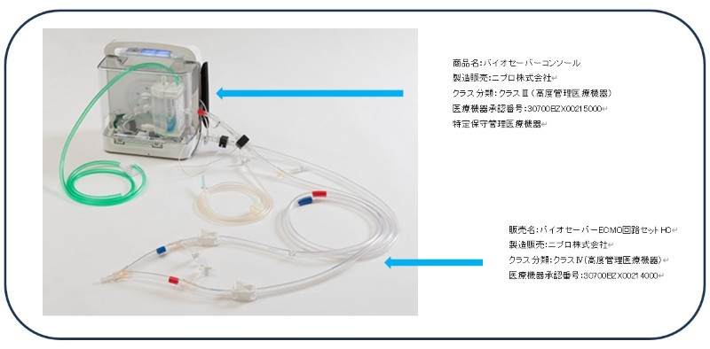 本医療機器は、「バイオセーバー® ECMO回路セットHC」(以下、「ECMO回路セット」)と「バイオセーバー® コンソール」で構成されます。ECMO回路セットは優れた耐久性と血液適合性を備えた「バイオキューブ®」ニプロコーティング膜型人工肺と「バイオフロート®」遠心ポンプ、カニューレを組み込んだヘパリンコーティング回路セットであり、ECMO治療の必要性に応じて最長14日間の連続使用を可能とします。